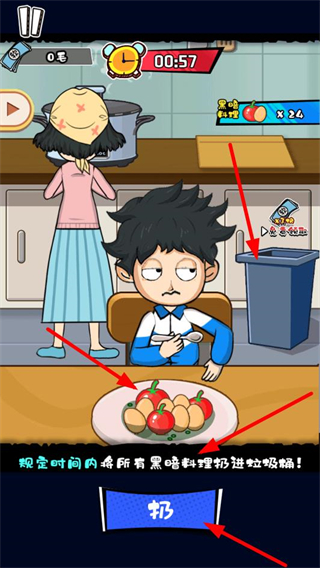 1、進入關卡后,在規定時間內點擊盤里的黑暗料理,再點擊扔按鈕,將其扔進垃圾桶,完成該關卡的任務目標。