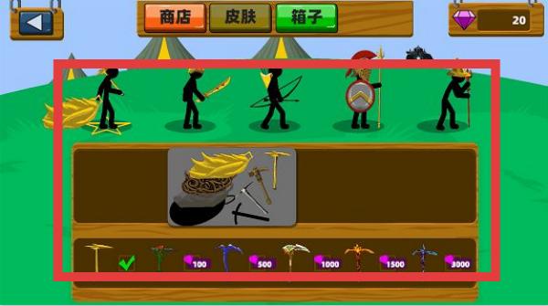 1、玩家可根據個人喜好在皮膚選擇界面的火柴人外觀,同時在武器庫中挑選趁手的裝備,然后正式踏入充滿挑戰的幻想戰場。