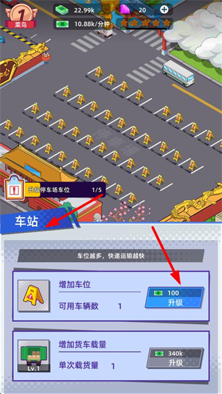 3、進入車站界面,看到增加車位的選項,點擊升級按鈕消耗100資源增加車位,提升可用車輛數,加快快遞運輸速度。
