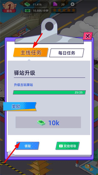 2、完成驛站升級的主線任務后,打開任務界面,點擊領取按鈕,可獲取對應的10k資源獎勵,積累經營所需的資金。
