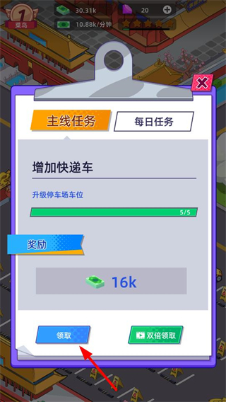 4、完成增加快遞車的主線任務后,打開任務界面,點擊領取按鈕,可獲取對應的16k資源獎勵,助力后續的經營升級。