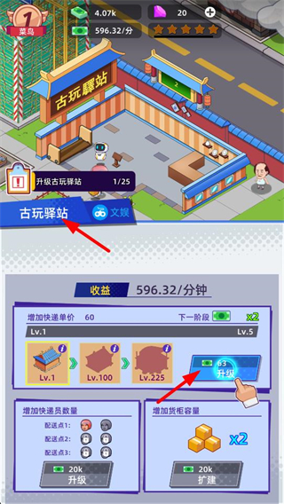 1、在古玩驛站界面,可看到收益數據,點擊升級按鈕消耗對應資源升級驛站,提升快遞單價,增加每分鐘的收益效率。