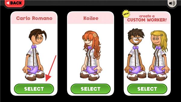 2、接著來到角色選擇環節界面上展示著不同的角色形象,比如Carlo Romano,你只需點擊角色下方的綠色SELECT按鈕,就能選定他作為自己在游戲里的化身。