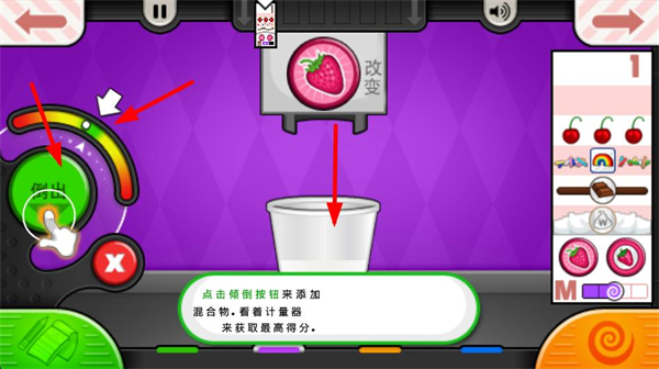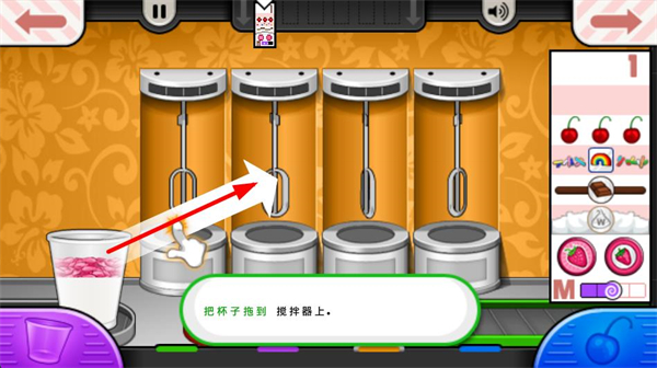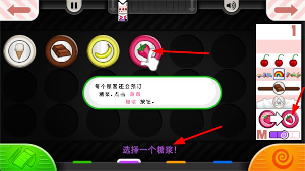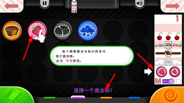 1、進入制作環節后,根據顧客訂單選擇對應的混合料,比如草莓款,點擊對應的按鈕來選定,為冰淇淋準備基礎配料。