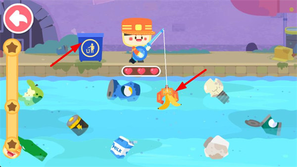 4、使用工具打撈河道里的垃圾,將其扔進垃圾桶,完成清潔任務,積累環保類獎勵,解鎖新的清潔場景。