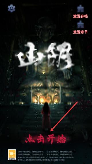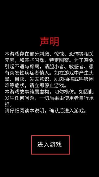 1、玩家點擊開始進入游戲,跟隨劇情發展在恐怖場景中冒險,游戲通過文字和畫面營造恐怖氛圍,如聲明中提及的刺激驚悚元素,讓玩家沉浸在懸疑情境里。