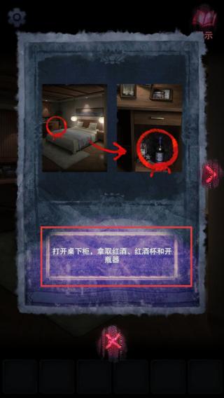 2、玩家需在場景中尋找線索和道具,按提示完成任務,像打開桌下柜,拿取紅酒、紅酒杯和開瓶器,通過解開謎題推動游戲進程,探索背后的故事真相。
