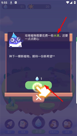 1、看到提示培育植物需要花費水滴和耐心,點擊種下按鈕,消耗1個水滴就能種下新植物,期待新希望的成長。