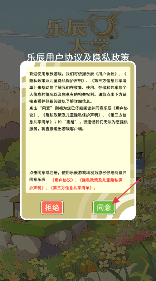 1、打開樂辰大學,閱讀樂辰用戶協議及隱私政策內容,點擊綠色同意按鈕,進入下一環節。