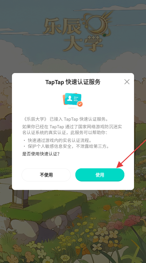 2、出現TapTap快速認證服務提示,若已在TapTap實名認證,點擊使用按鈕,快速通過游戲內實名認證。