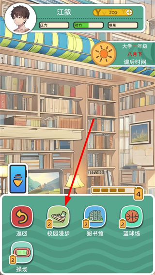 4、可選擇校園漫步、圖書館等場景活動,不同場景有不同功能,參與活動提升角色屬性,推進大學生涯進程。
