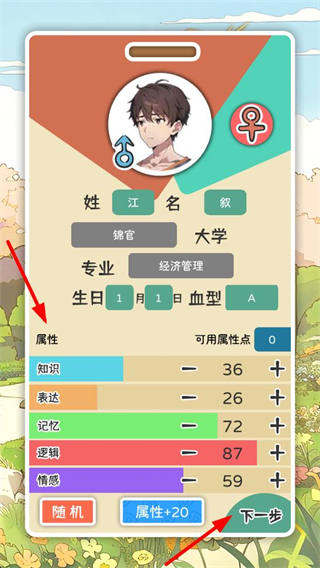 1、創建角色時可設置姓名、專業、生日等信息,分配知識、表達、記憶等屬性點,調整后點擊下一步開啟大學生涯。