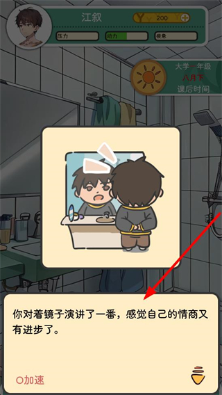 3、在大學生活里會觸發隨機事件,如對著鏡子演講提升情商,通過完成事件提升角色能力,豐富大學生活體驗。