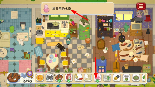 2、在室內場景找到旅行用的水壺,點擊該物品后,背包里對應的水壺圖標會標記完成,同時收集進度會提升,繼續尋找剩余物品。
