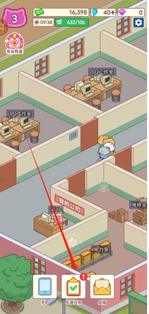 1、任務引導起步:進入游戲點擊任務清單,查看已完成任務領取獎勵,根據未完成任務提示,快速了解游戲基礎玩法,購買辦公設施邁出創業第一步。