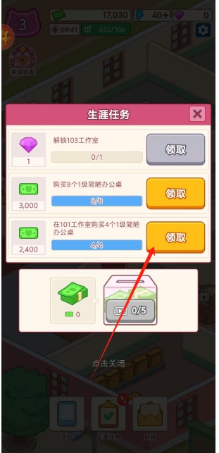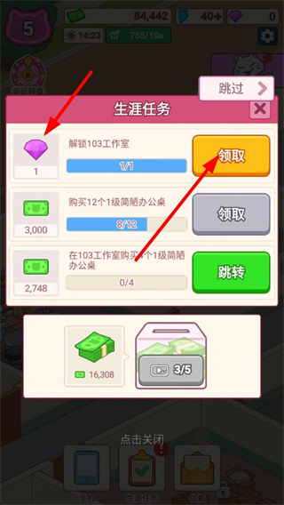 4、完成生涯任務可領取獎勵,如解鎖103工作室后,點擊領取可獲得鉆石等獎勵,推動任務進度,助力公司發展。
