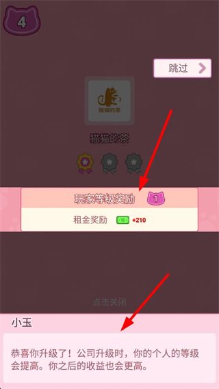 2、公司升級時個人等級也會提高,升級可獲得玩家等級獎勵,如租金獎勵加210,之后收益會更高,小玉會給予升級恭喜。