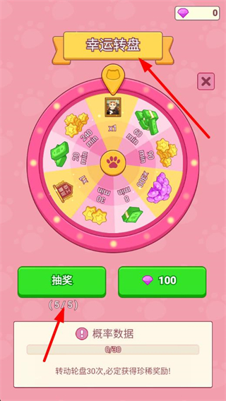 1、有幸運轉盤玩法,可點擊抽獎按鈕參與,轉動30次必定獲得稀獎勵,也可花費100鉆石抽獎,有機會獲得金幣、道具等獎勵。