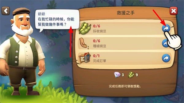 2、接收到救援之手任務,按要求完成探索播種等子任務,通過點擊對應按鈕推進任務進度,積累任務完成度。