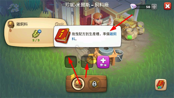 1、進入飼料廠界面,按提示拖曳配方到生產槽,籌備制作飼料的材料,完成飼料的制作準備,推進養殖相關流程。