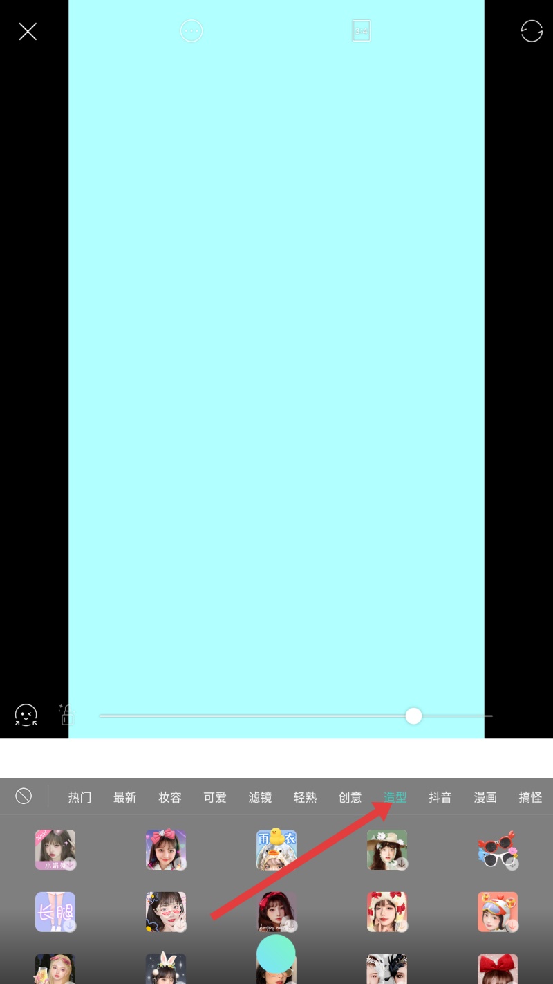 3、點擊造型分類,可選擇小奶兔、長腿等造型貼紙,為自拍打造獨特的造型風格,增加自拍的創意性。