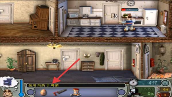 1、廚房整蠱,在廚房場景,點擊下方瀉藥+雞蛋組合,趁鄰居不注意,按提示對其使用,觸發腹瀉整蠱效果。