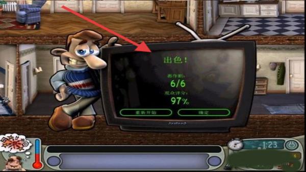3、關卡結算,整蠱成功后,電視顯示評分如6/6惡作劇、97%配合度,點【確定】結算,開啟新關卡。