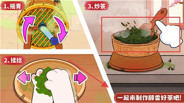 1、全流程互動體驗:從茶園選址到茶葉裝罐的12道工序均設計趣味交互,如晾曬時調整竹匾角度接收陽光,烘焙時滑動屏幕控制火候,讓抽象制茶過程可視化。
