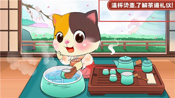3、跟著可愛小貓,進行溫杯燙壺操作,同步了解茶道禮儀,實踐互動里,輕松掌握傳統茶藝文化。