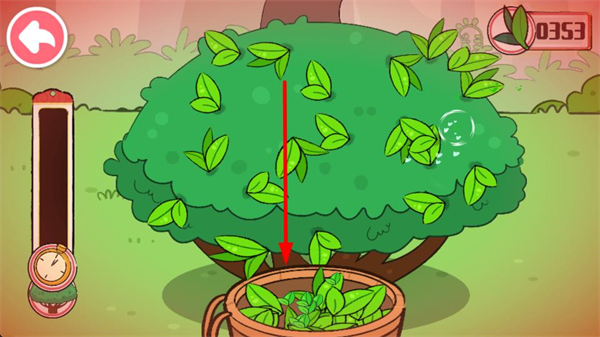 1、操控小猴移動到茶樹位置,采摘茶樹上的茶葉,積累茶葉數量,推進采茶環節的進度。