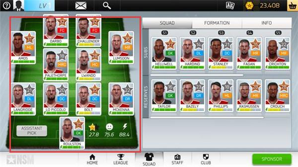 2、進入陣容界面,挑選球員、調整陣型,根據球員屬性與賽事類型,組建參賽陣容。