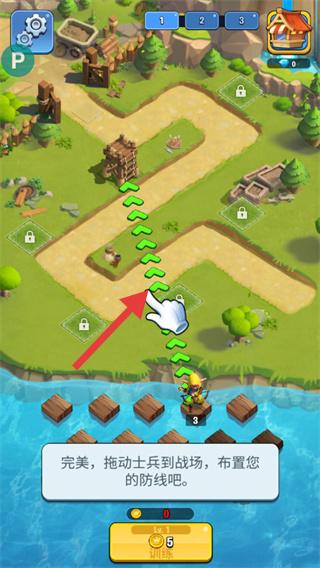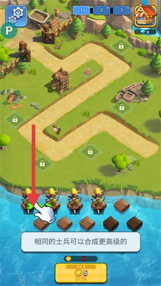 3、合成操作結束拖動士兵到戰場,布置您的防線吧指引,把士兵從水域木樁拖動到陸地上的黃顏色路徑,構建防御體系,抵御即將來襲的敵人,守護城堡。