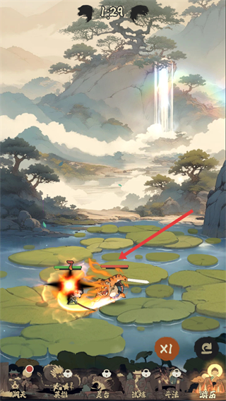 3、戰斗過程角色自動攻擊敵人,釋放技能造成傷害,在帶有山水風景的場景,擊敗敵人推進戰斗進度。