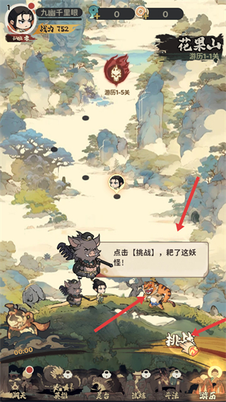 1、在花果山場景里,點擊挑戰按鈕,與妖怪戰斗,推進游歷關卡,提升戰力,探索不同的西游場景。