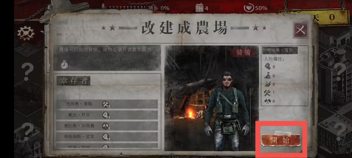 3、在改建成農場界面,選定馬特奧等幸存者,點擊開始按鈕,啟動農場改建作業。