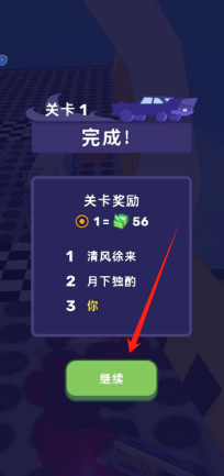 3、沖過終點觸發完成結算界面,確認清風徐來等排名獎勵,點擊繼續按鈕,進入下一關卡流程。