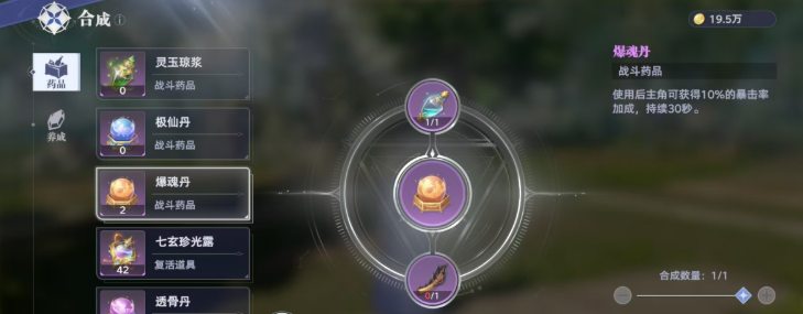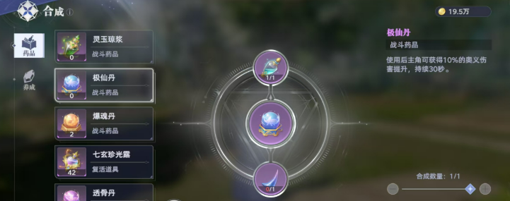 2、藥品合成在戰斗中至關重要,靈玉瓊漿能瞬間恢復25%生命值,助玩家脫離險境;極仙丹可提升10%奧義傷害,爆魂丹帶來10%暴擊率加成,為制勝提供關鍵助力。