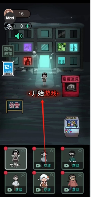 2、界面布局清晰,以暗色調營造氛圍,12+適齡提示明確,功能區涵蓋公告、道具、角色等板塊,便于快速了解基礎設定。