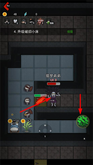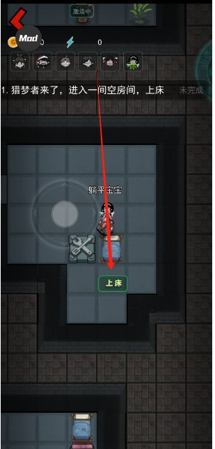 1、畫面呈現戰斗場景,玩家操控角色鄔平寶寶,身處房間場景,上方有任務提示獵夢者來了,進入一間空房間,上床,中間上床按鈕為核心交互點。