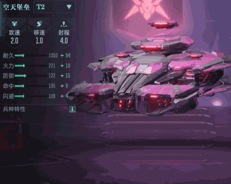 1、空天堡壘T2攻速2.0、移速1.0、射程4.0,耐久1150+84,火力221+19,攻防兼備,空戰適配性強。