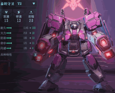 1、泰坦守衛T2攻速1.5、移速1.3、射程2.0,耐久1145+103,高耐久讓它成為前排抗傷主力。