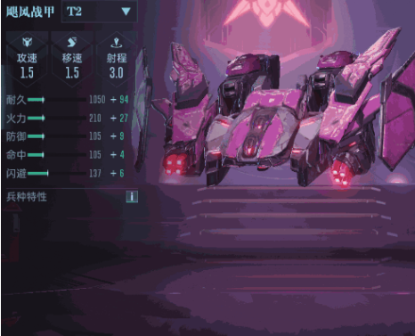 1、颶風戰甲T2攻速1.5、移速1.5、射程3.0,耐久1050+84,機動性與射程結合,支援靈活。