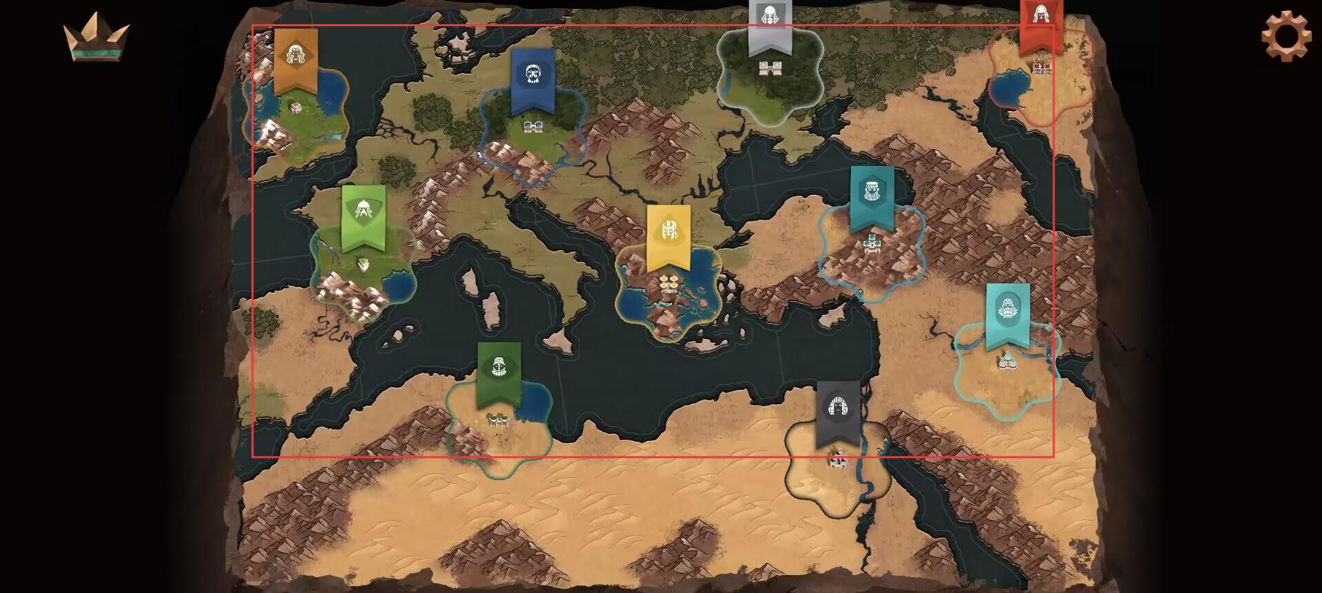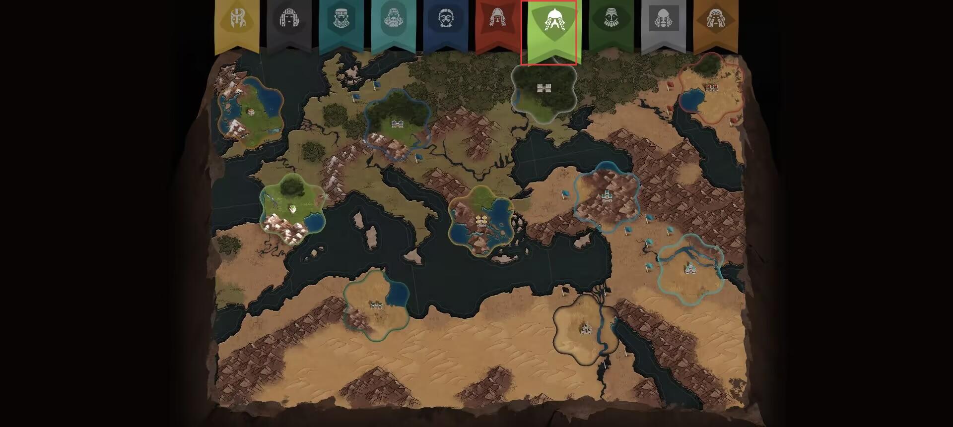 1、進入大地圖界面,查看紅框標識的可探索區域,分析各區域旗幟代表的勢力分布,規劃初始擴張路線。
