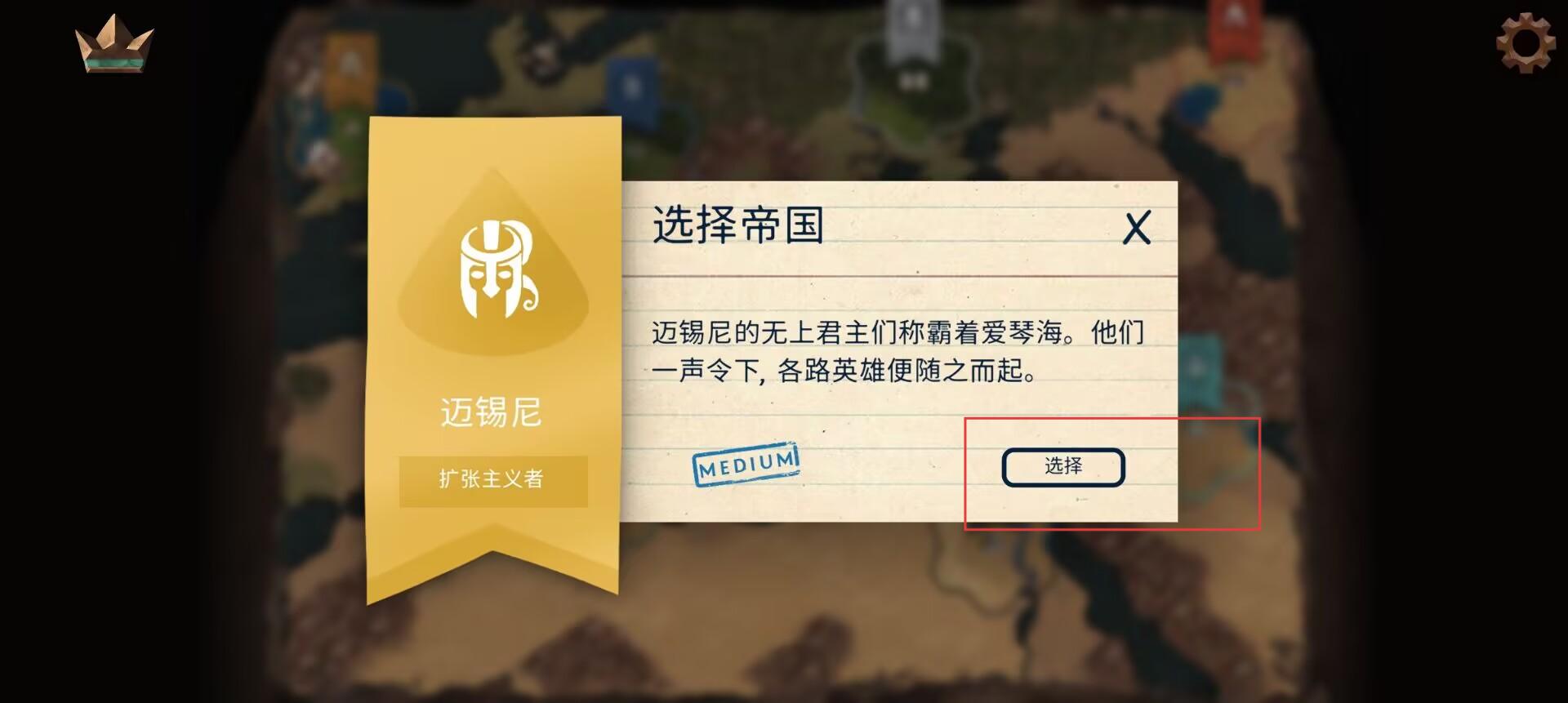 2、觸發選擇帝國彈窗,閱讀邁錫尼勢力介紹,確認其擴張主義者特性,點擊選擇按鈕,選定勢力。