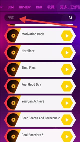 1、進入音樂游戲曲庫界面,在搜索欄輸入或選擇想聽的音樂,如MotivationRock等,點擊播放,加載對應音樂關卡。