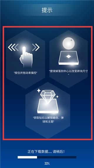 2、節奏把握要點:仔細聆聽音樂,彈球將隨節拍跳躍,務必緊跟節奏,保證彈球準確跳躍到磚塊上,千萬不要跳過磚塊,否則挑戰失敗。