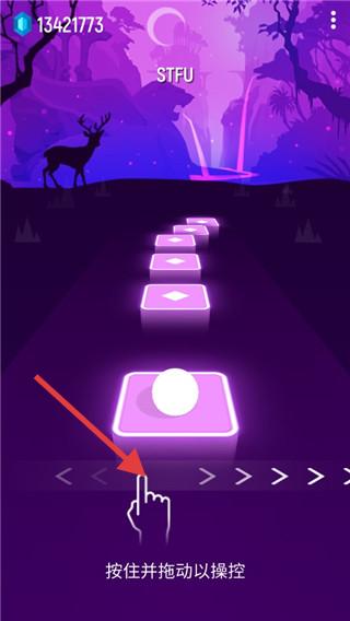 3、數據下載完畢,進入音樂游戲場景,依據按住并拖動以操控指引,操作白色球體在發光磚塊路徑滾動,跟隨著音樂節奏,獲取游戲分數,推進音樂關卡挑戰。