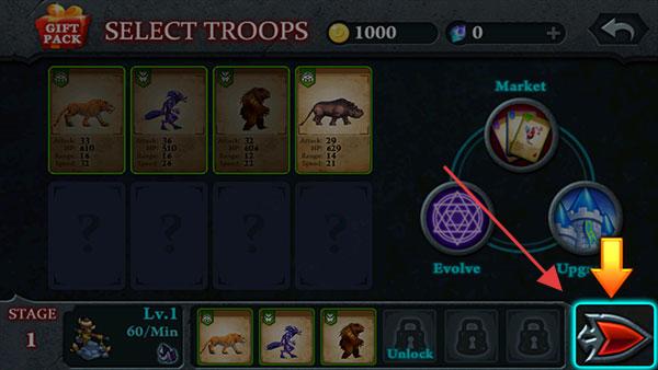 2、挑選完成后,點擊右下角的箭頭開始戰斗,戰斗界面的左下角顯示的是資源,右下角是消耗資源可以使用的技能。
