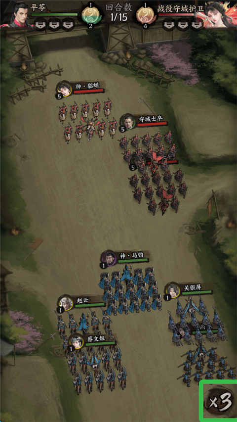 2、選擇上陣將領,也可點擊一鍵上陣,在戰斗中可設置游戲速度。