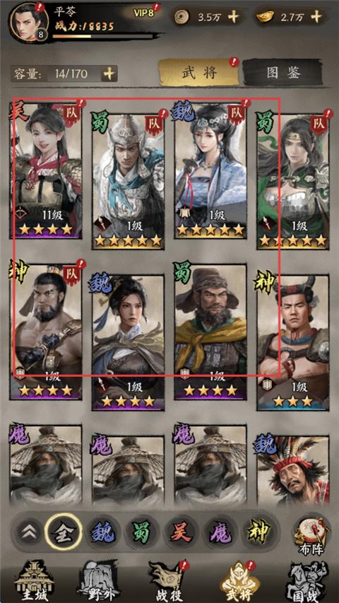 3、在武將界面可以對武將進行升級,為武將進行升級和裝備穿戴。